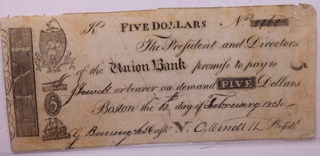 1808 $5, UNION BANK., Boston, MASS., Store #18590