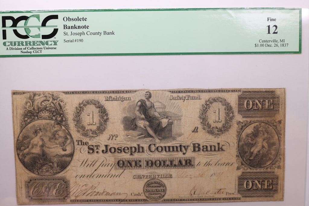 1837 $1., St Joseph County Bank., St Joseph, MI., PCGS F-12., Store #GMI017