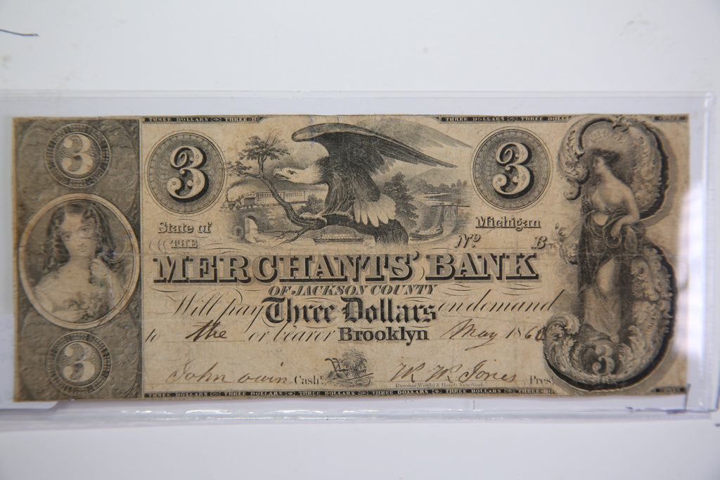 1840 $3, Brooklyn, Michigan., Obsolete Currency, Store Sale 0932487