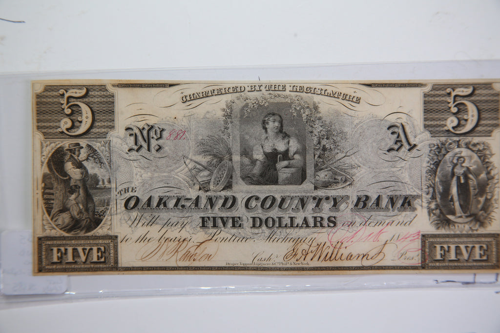 1843 $5, Pontiac., Michigan., Obsolete Currency, Store Sale 09322557