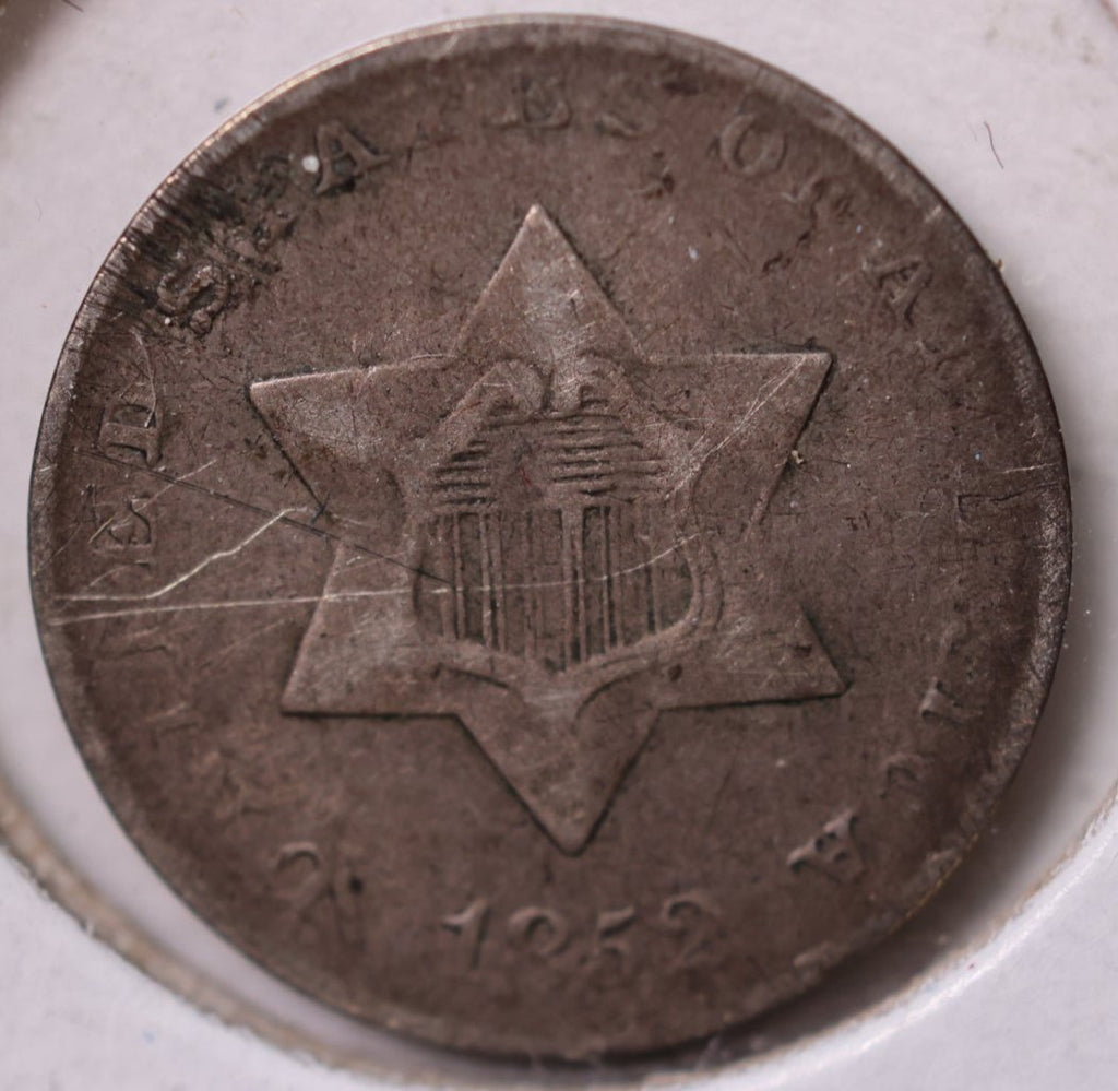 1852 3 Cent Silver., TRYME., Very Fine Circulated Coin., Store #2219