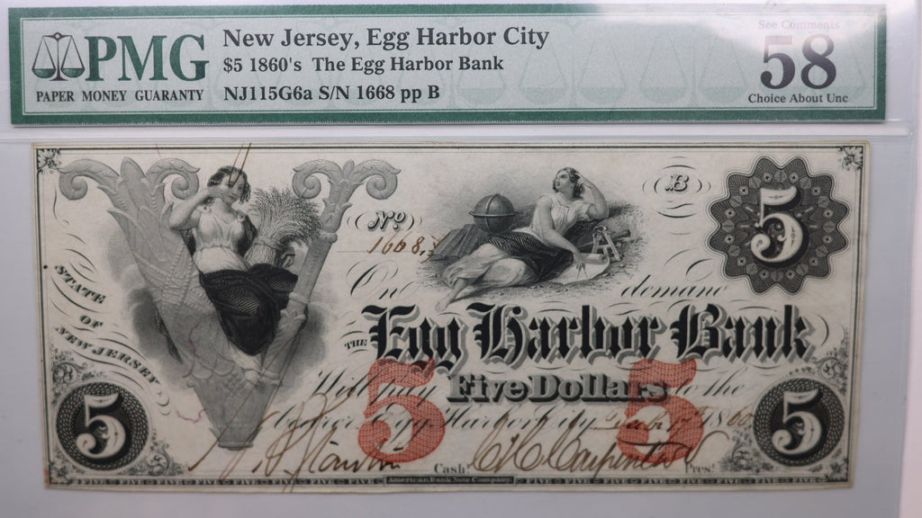 1860 $5., Egg Harbor City, N.J., Obsolete., PMG AU-58., Store #GNJ002