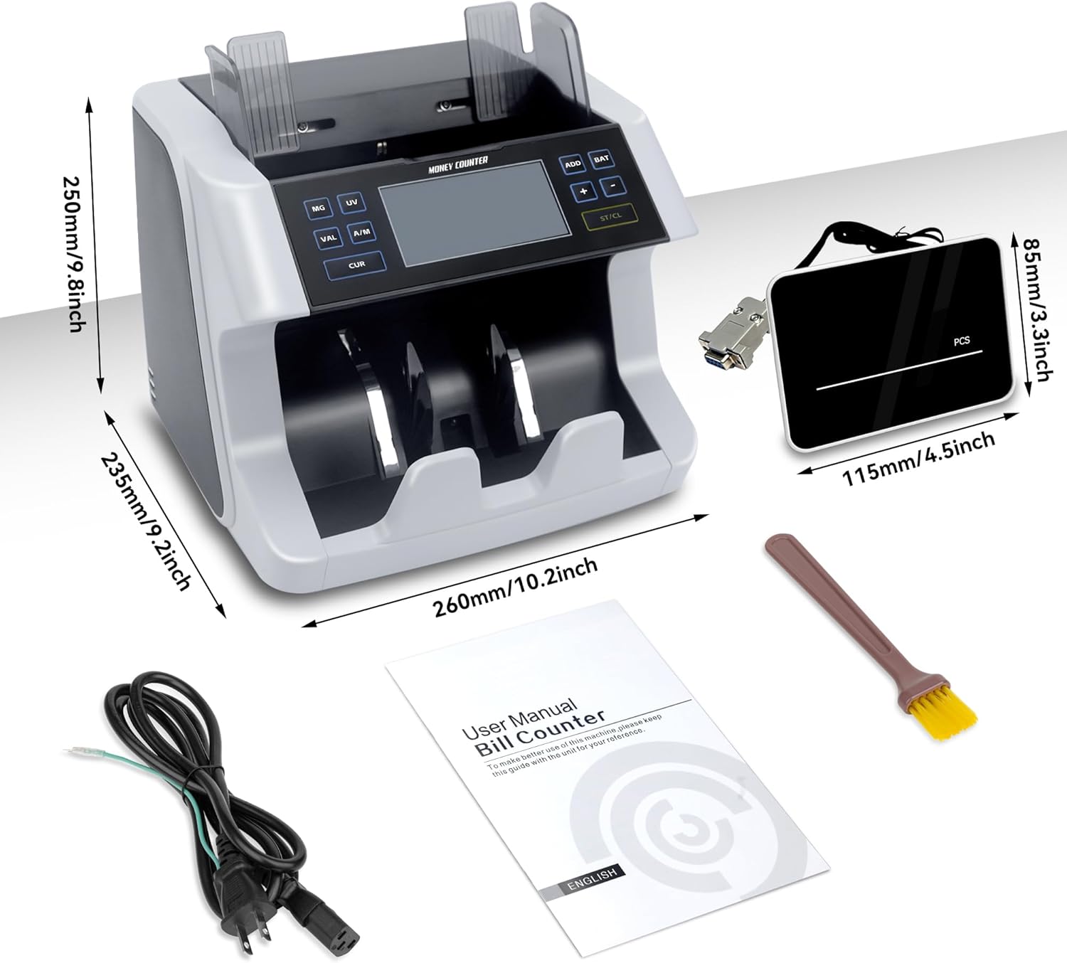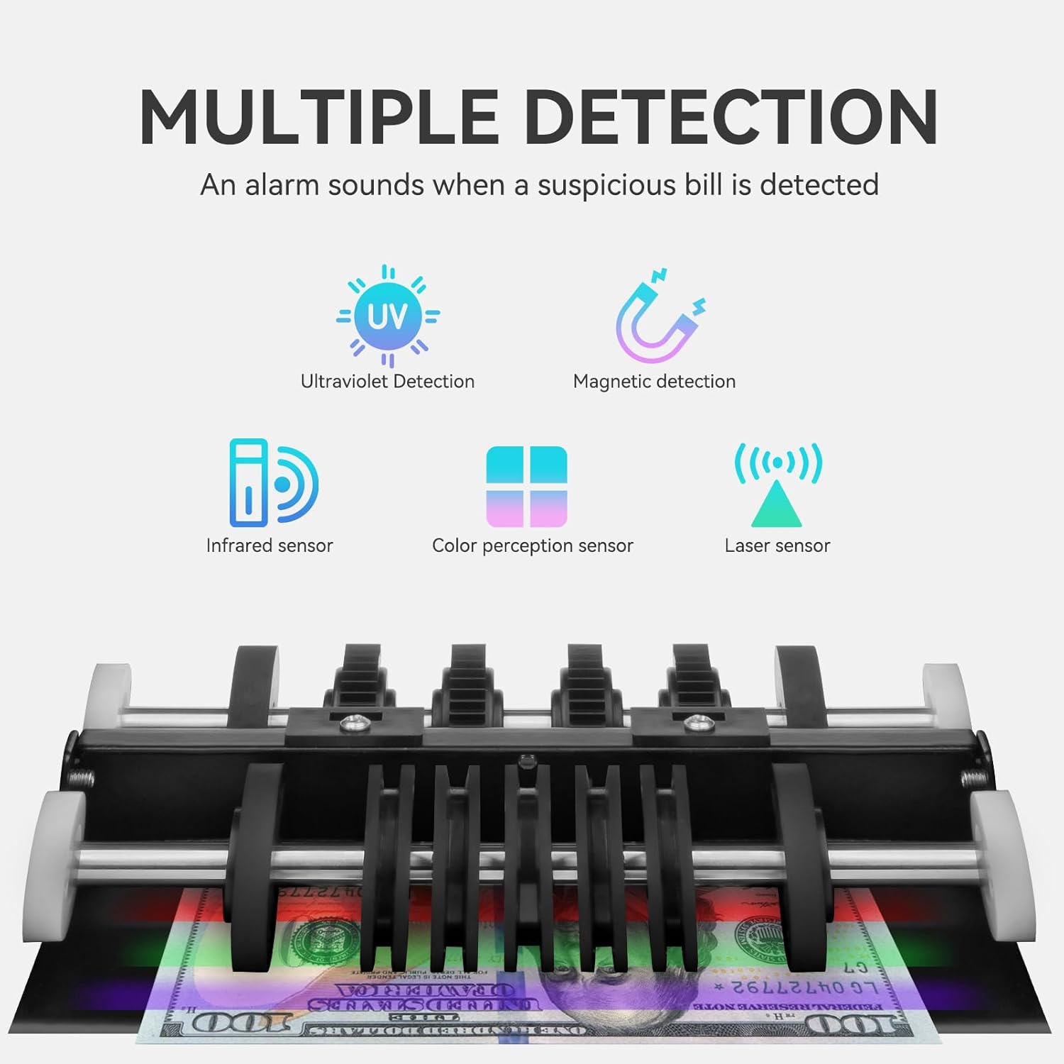 - [Reliable Counterfeit Detection Technology]:Our money counter machine features advanced counterfeit detection capabilities using UV (Ultraviolet), IR (Infrared), and MG (Magnetic) technologies. This ensures that you can confidently accept only genuine bills, making it ideal for banks, retail stores, and any business that handles cash. With this cash counter machine, you can effectively protect your assets and maintain secure transactions.