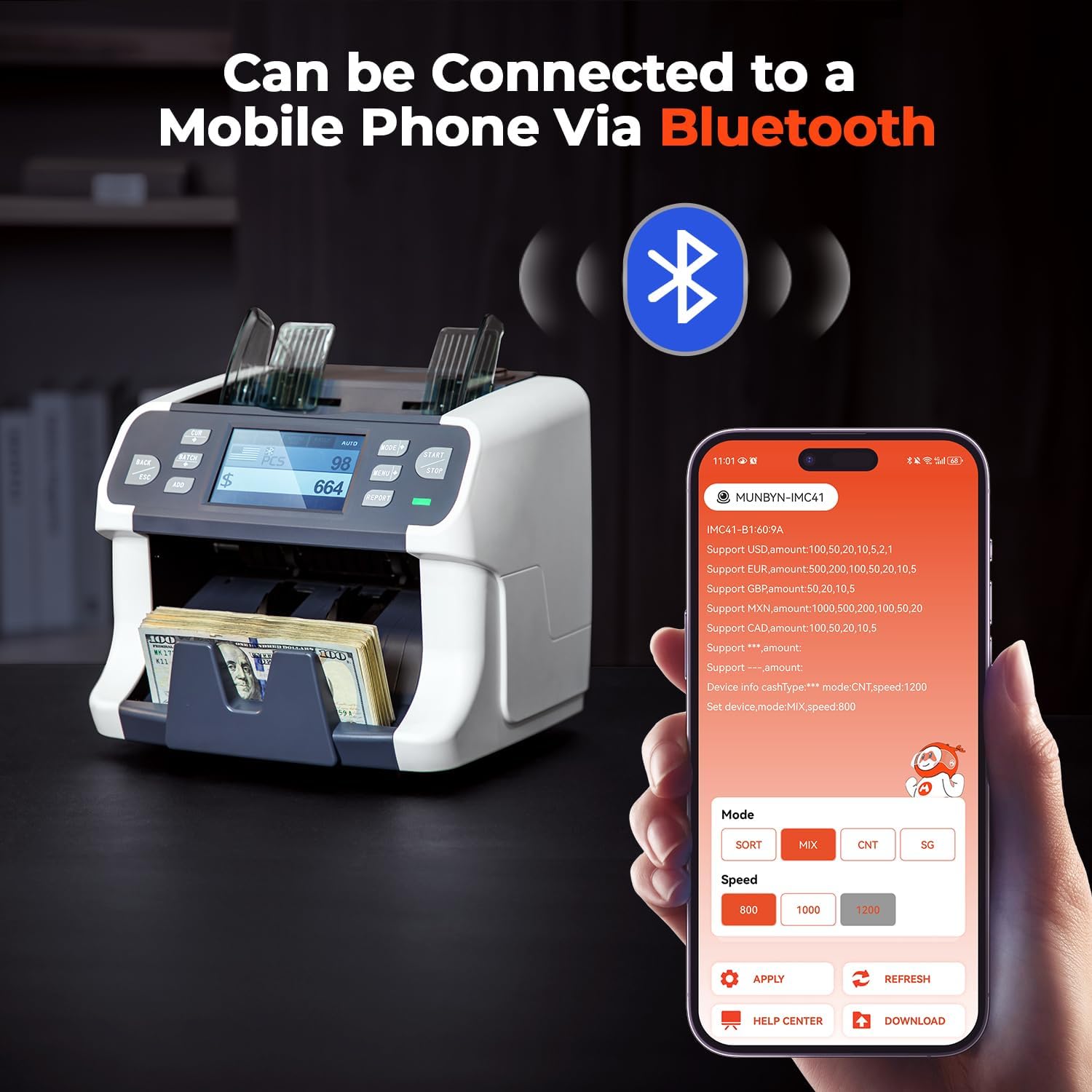 - Mobile Connection: As a leading player in the money counter market, the MUNBYN IMC41B mixed denomination money counter now comes with Bluetooth connectivity, and only needs to be connected through the Munbyn Counter APP. Note: The user manual will provide app installation tutorials