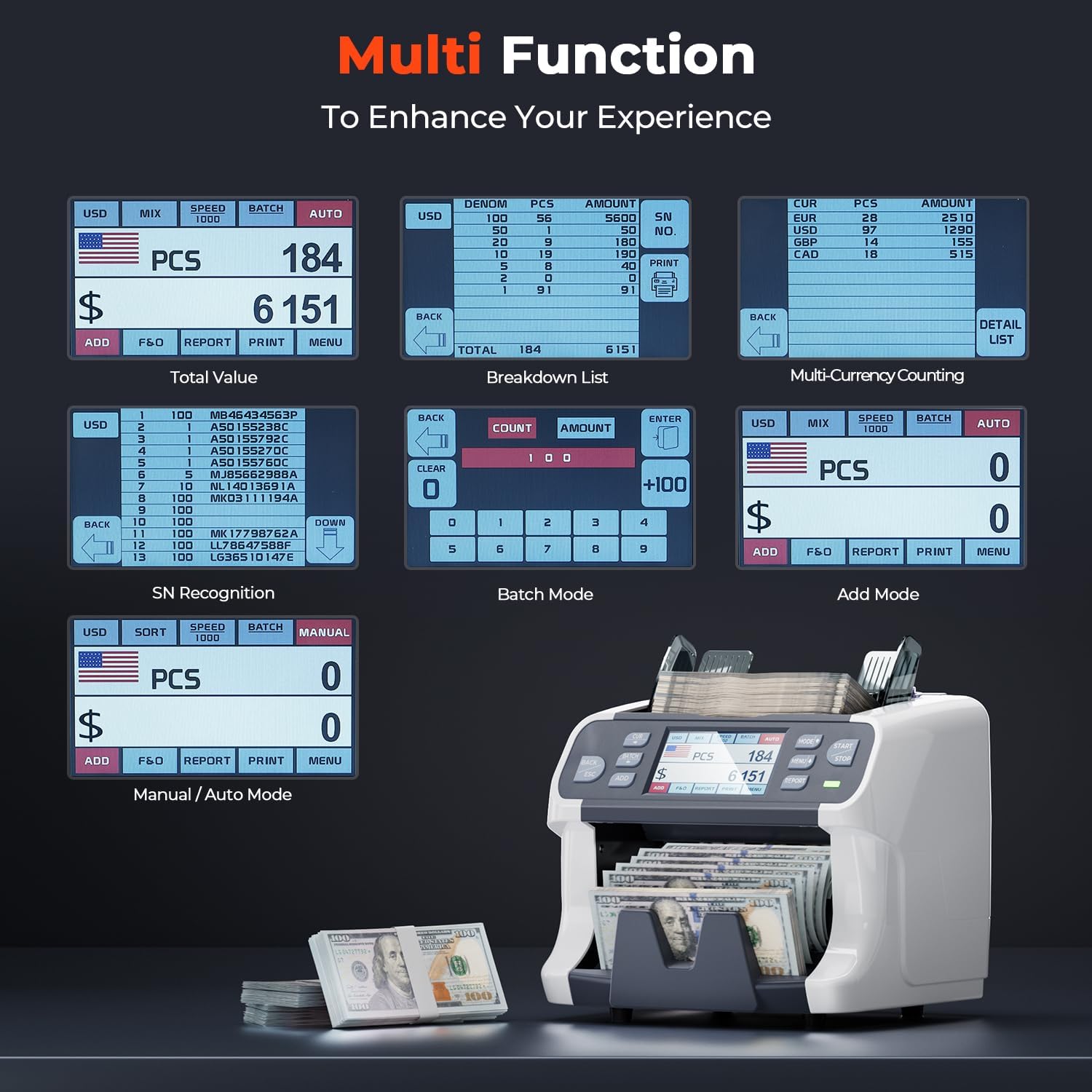 – **Multiple Functions:** Includes mixed denomination, manual sorting, ADD, BATCH, ADD & BATCH, and Auto/Manual counting.