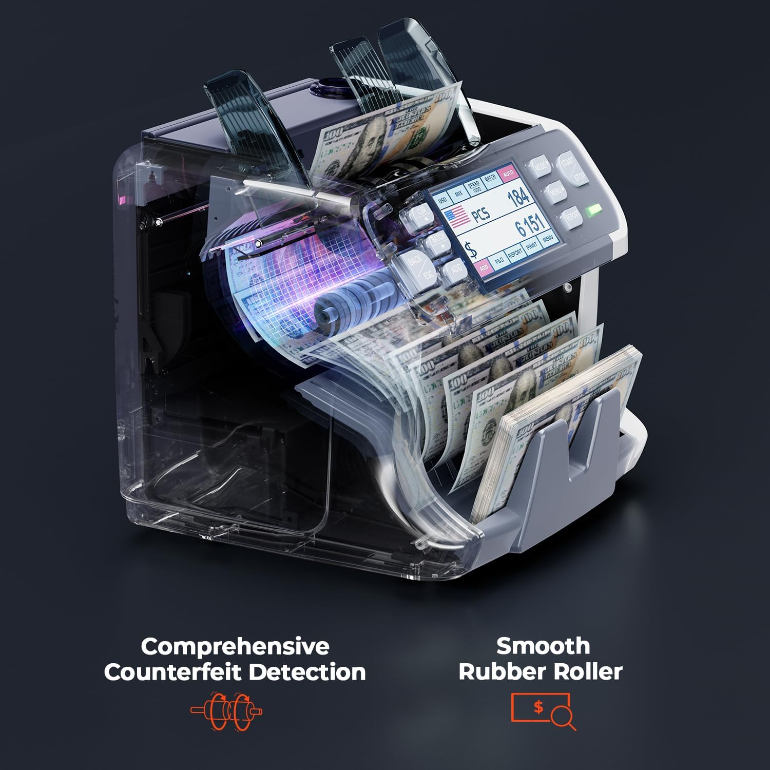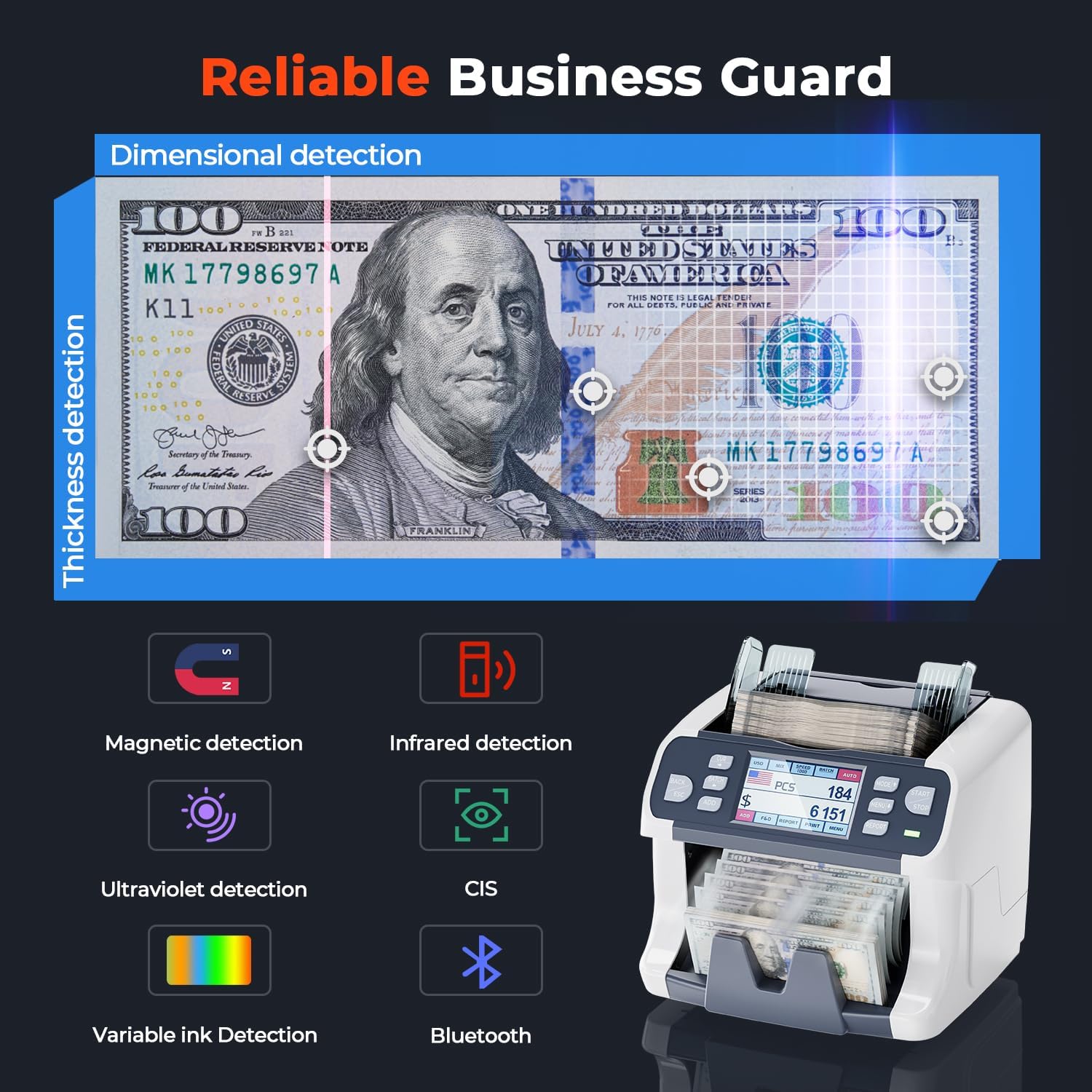 - Business Guard: Cash counting machine boosts your efficiency on cash counting job with the following functions: Mixed denomination, manual sorting based on first denomination or currency, ADD, BATCH, ADD & BATCH, and Auto/Manual counting. Has CIS, UV, MG, IR, MT, and SN Recognition, 11 counterfeit detection methods to ensure your bills’ authenticity