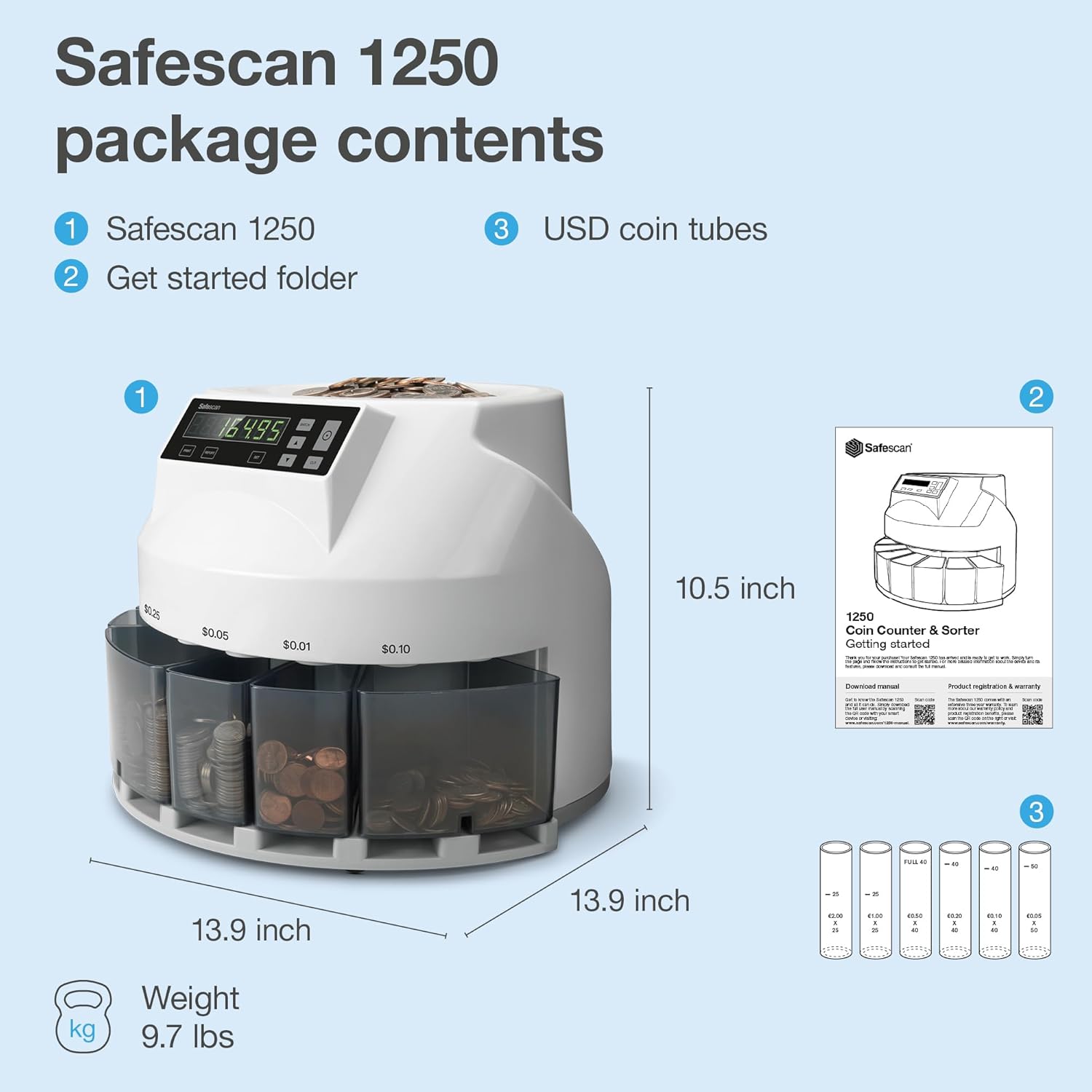 - EFFORTLESS COIN ROLL CREATION: Easily organize your coins. The Safescan 1250 does not only count and sort your coins, but can also create coin rolls. Simply replace the coin cups with the included coin tubes and start the count. The Safescan 1250 will automatically stop when it hits the right number of coins. It’s that easy. The Safescan 1250 works with all standard USD coin rolls (not included).